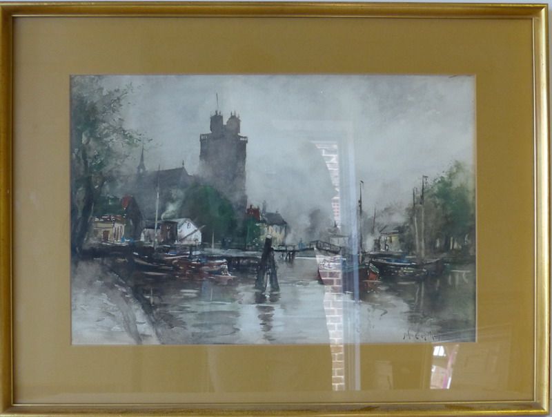 | depicting moored sailing boats and barges with figure crossing wooden bridge | |
