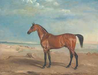 | The Arab stallion 'Orelio' in a desert landscape, other horses and figures beyond | |