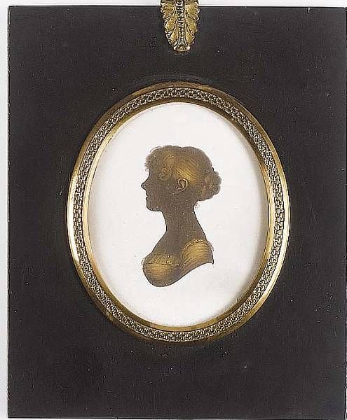 A silhouette of Jane Bayly, profile to the left, wearing dress with lace trim, her hair upswept.