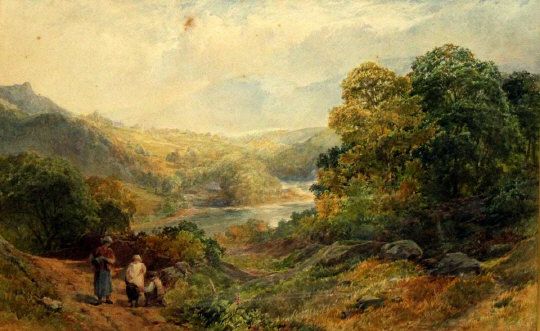 Extensive Mountainous River Landscape with Figures and Dog in foreground
