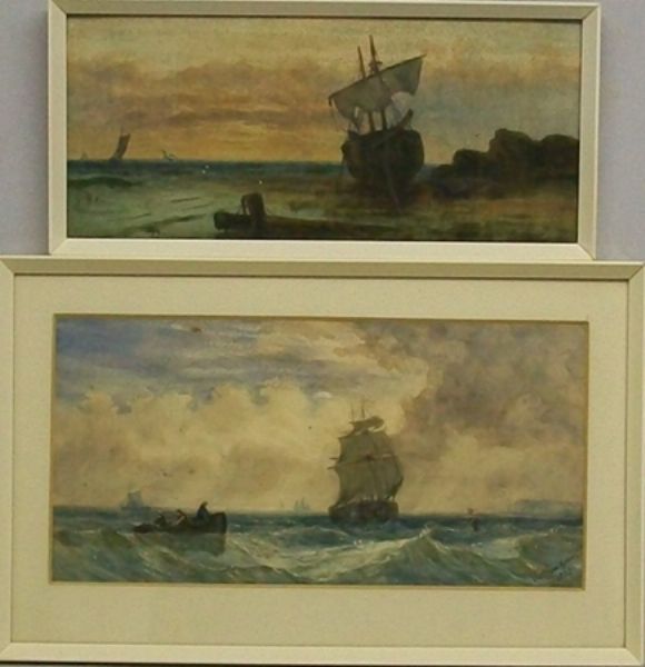 | watercolour of a maritime seascape with rowing boat, figures and a larger ship | |