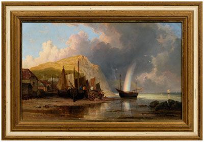 | After the Storm, fishermen on a beach with boats, distant rainbow | |