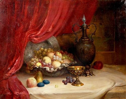 | A still life with apples and grapes in a silver bowl and a decanter and gold goblet to the side | |
