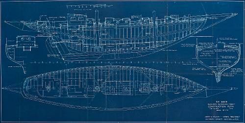| A line drawing No. 669 for an auxiliary cruising cutter including the hull lines in profile, sectional and top views. | |