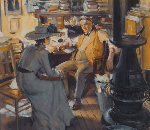Older man at desk and young woman sit near pot bellied stove