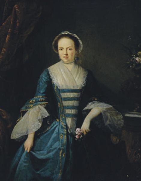 | Portrait of a lady in a blue dress, three-quarter length, holding a rose | |