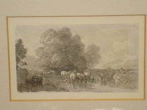 A pair of sketches, cattle watering and a country lane