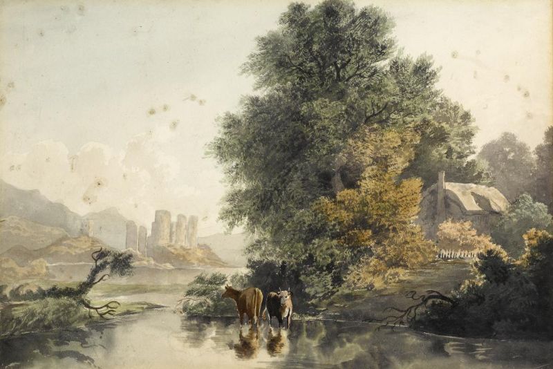 LANDSCAPE WITH CATTLE WATERING BY A RIVER BANK