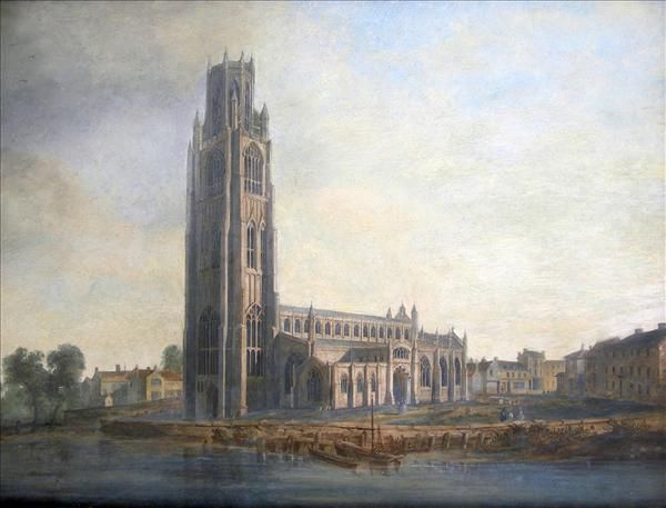 | Boston Stump, Lincolnshire, from the river with figures and boats, the town beyond | |