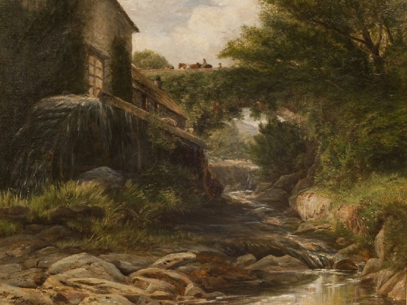 WATERMILL WITH FIGURES ON A BRIDGE BEYOND