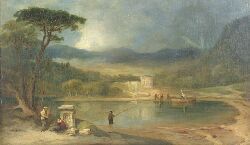 LANDSCAPE WITH TEMPLE RUINS AND FISHERMAN IN THE FOREGROUND