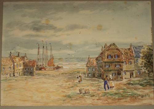 Fishing village on the coast with figures