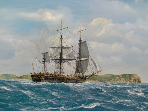 'The Endeavour' - three-masted sailing vessel just off the coast