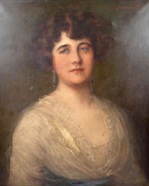 PORTRAIT OF MURIEL HINE, HALF LENGTH IN A WHITE DRESS