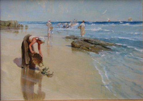 Lady on beach releasing crabs, with further figures in distance setting out in rowing boat