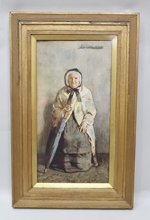 Patiently Waiting, a seated elderly lady in bonnet with rolled umbrella