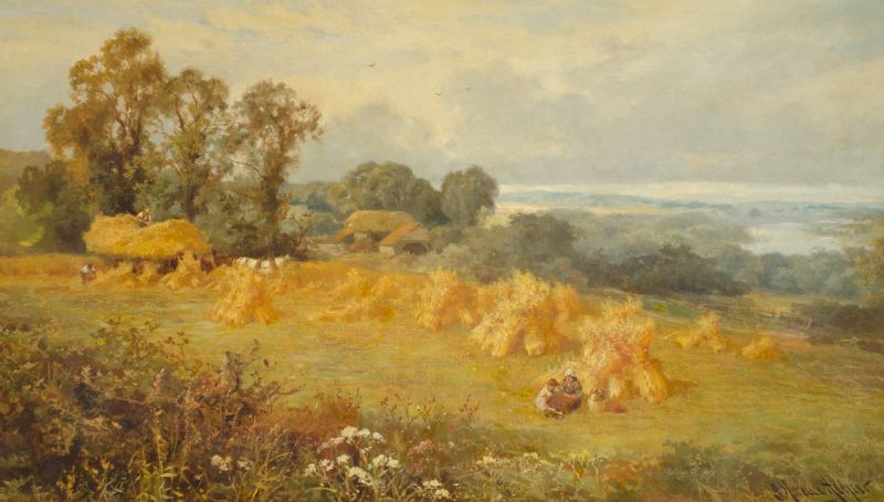 | Wheat Harvest, landscape with figures working in the fields with cottage and river in the background | |