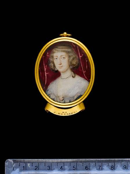| A Lady, wearing blue dress with white lace collar fixed at the breast with a pink flower, pearl necklace and pendent earrings, h | |