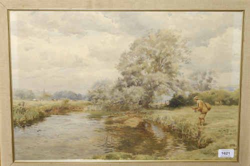 | Angler Fishing beside a River, cattle grazing in a summer landscape nearby | |