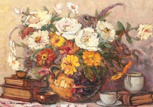 Still life with books and daisies