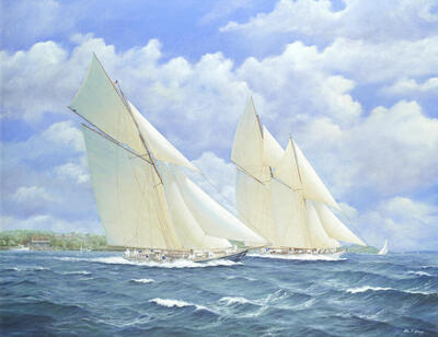 | Britannia and Westward racing off the Isle of White with the Royal Solent Yacht Club in the distance | |