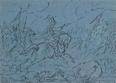 A battle scene and another of figures on horseback