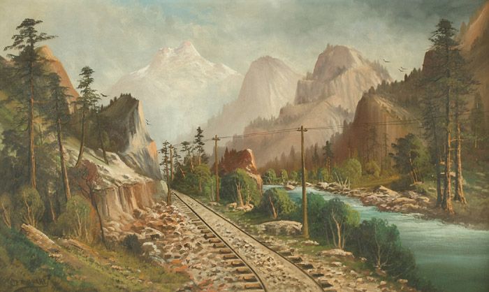 | Landscape with river valley and train tracks in the foreground and mountains beyond | |