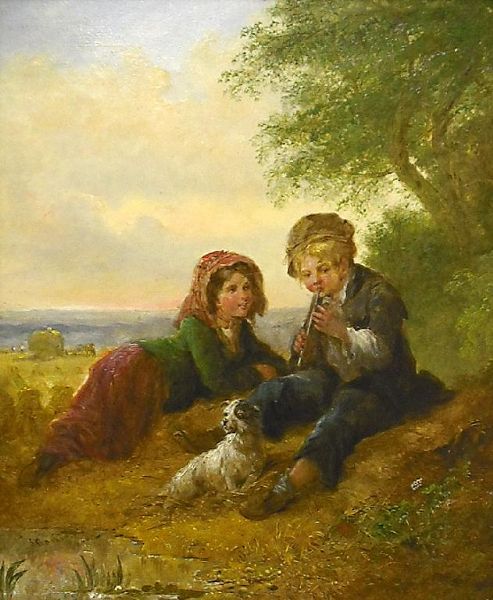 | farmer boy sat playing a whistle with a girl at his side and a terrier at his feet | |