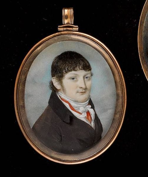 | A Gentleman, wearing brown coat with black collar, white waistcoat, red solitaire and tied white stock. | |