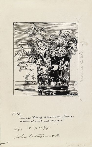 | Pen and black ink and gouache on paper mounted on card stock | |