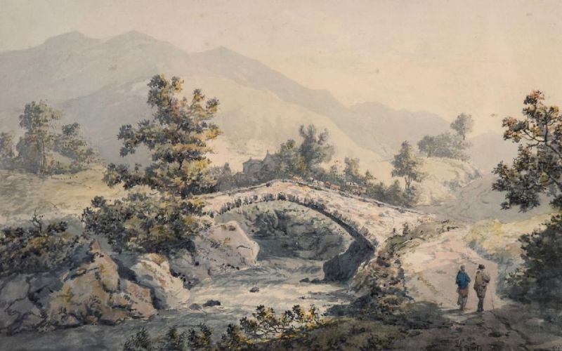| Malthyo in Montgomeryshire; a wagon and horses crossing a bridge, figures in the foreground, mountains beyond | |