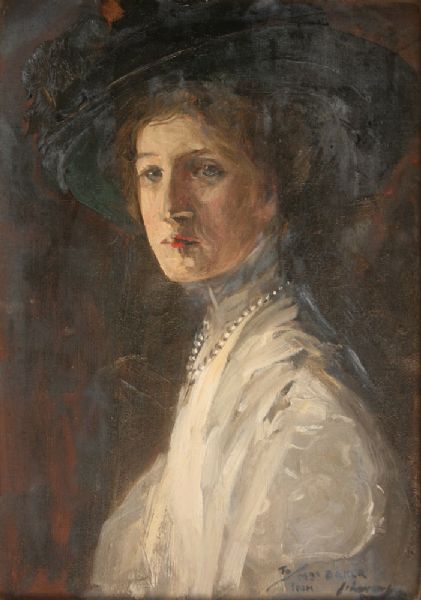 Bust Length Portrait of Mrs Baker wearing a Hat, White Blouse and Pearl Necklace,