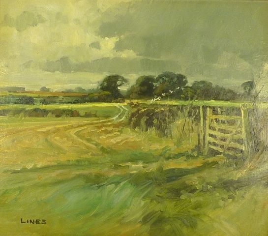 Autumn Gate, hedgerow and pasture with a distant copse of trees