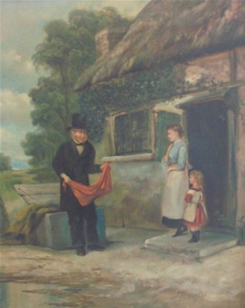 | Gentleman in suit and top hat conversing with a young mother and her daughter beside a thatched cottage | |
