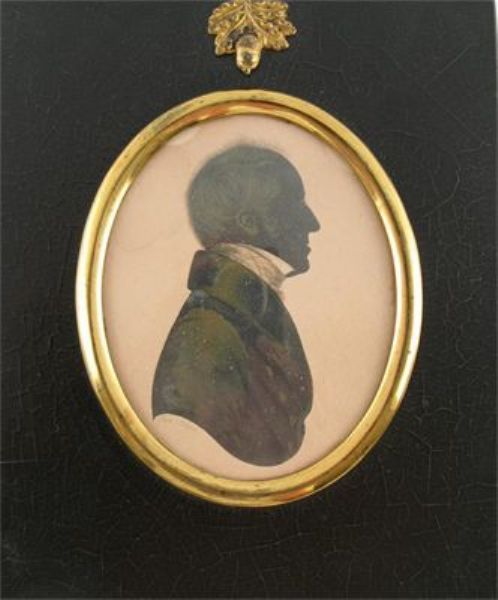 | A pair of silhouettes of a lady wearing a lace bonnet and shawl and a gentleman | |