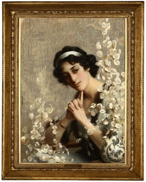 Edwardian Woman Sitting in an Armchair Admiring a Floral Display