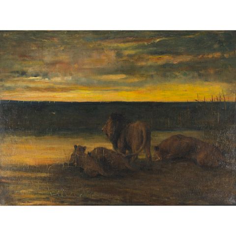 LIONS DRINKING - SUNSET, ON THE VELDT