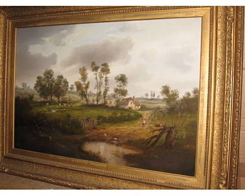 Country landscape with maid on a path before a cottage, and cattle and donkey in a meadow