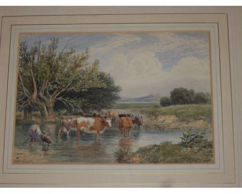 | Cattle watering at a ford with farmer and dog at the waters edge | |