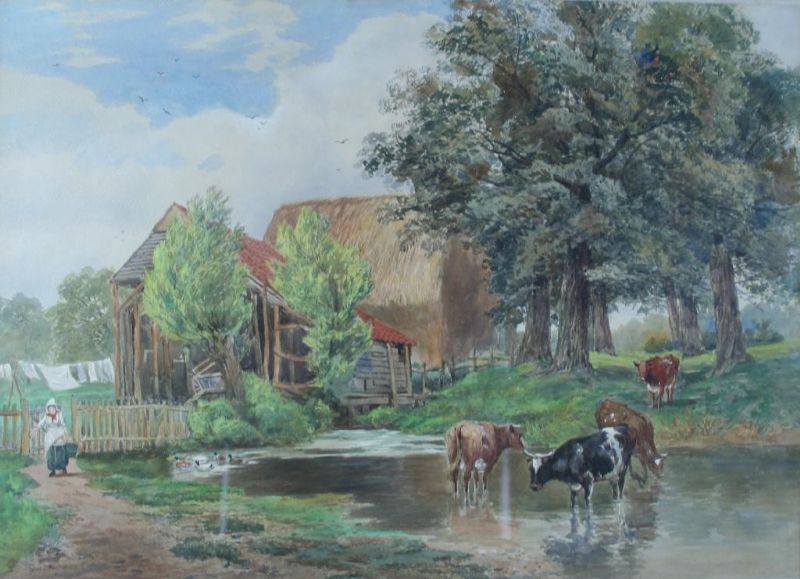 COWS WATERING IN A STREAM ON A FARM