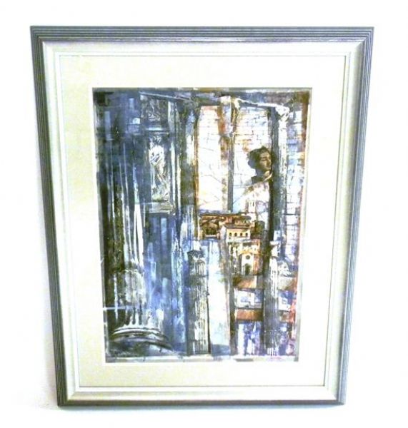 | depicts architectural elements mixed with a cityscape perspective, partially abstracted in a mix of cool tones with metallic hig | |