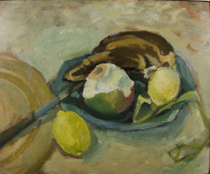 Still life -Lemon, apple and bananas on a plate