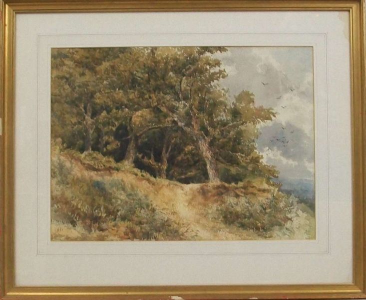 a wooded landscape with trees above a sandy bank, a flock of birds to the right