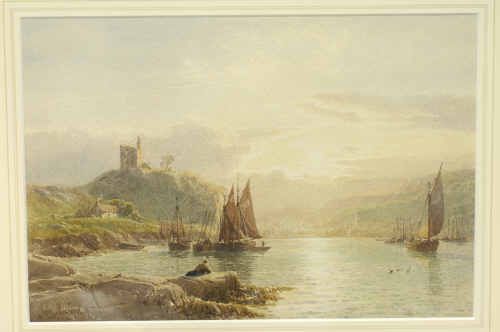| Estuary Scene with Fishing Boats, a figure in the foreground and a ruined castle on a hillside beyond | |