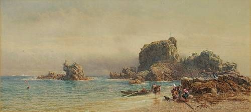 St Helier's Hermitage, a coastal scene with fisherfolk unloading a boat to the fore