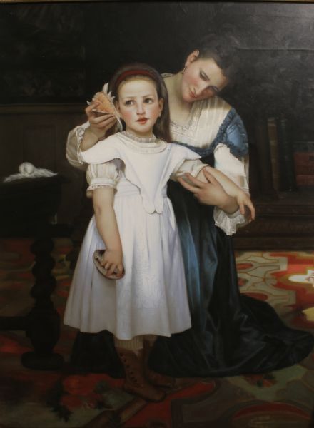 a Victorian style interior scene with a mother and child