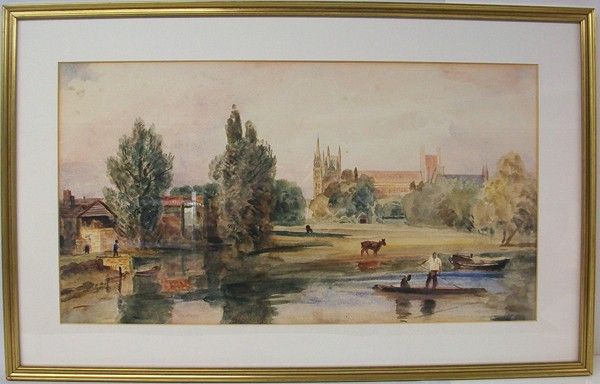 Peterborough Cathedral from the river with boats and cattle to fore