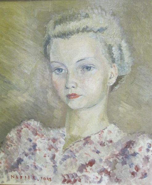 Portrait of Mrs Jack Horne¦quarter-length, wearing a¦patterned dress¦