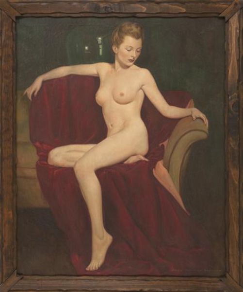 | Full-length portrait of a nude blonde woman sitting at the end of a sofa on a red velvet throw | |