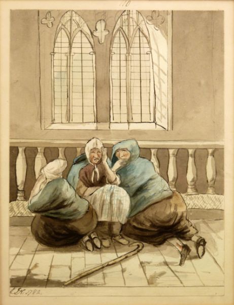 THREE FIGURES HUDDLED IN A CHURCH INTERIOR
